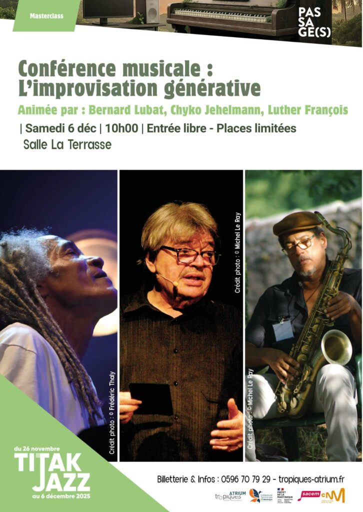Trois figures du jazz explorent les multiples dimensions de l’improvisation. Ils interrogent cette pratique qu’ils qualifient de générative : génératrice d’invention et découverte de nouveaux possibles, de nouveaux défis, de nouveaux récits. Cette conférence musicale se veut à la fois dialogue d’artistes, expérience d’écoute et invitation à repenser notre rapport à la création.