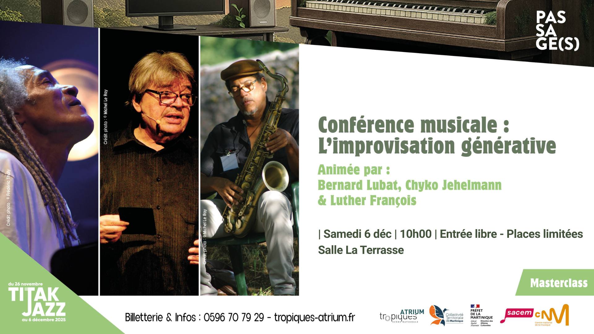 Trois figures du jazz explorent les multiples dimensions de l’improvisation. Ils interrogent cette pratique qu’ils qualifient de générative : génératrice d’invention et découverte de nouveaux possibles, de nouveaux défis, de nouveaux récits. Cette conférence musicale se veut à la fois dialogue d’artistes, expérience d’écoute et invitation à repenser notre rapport à la création.