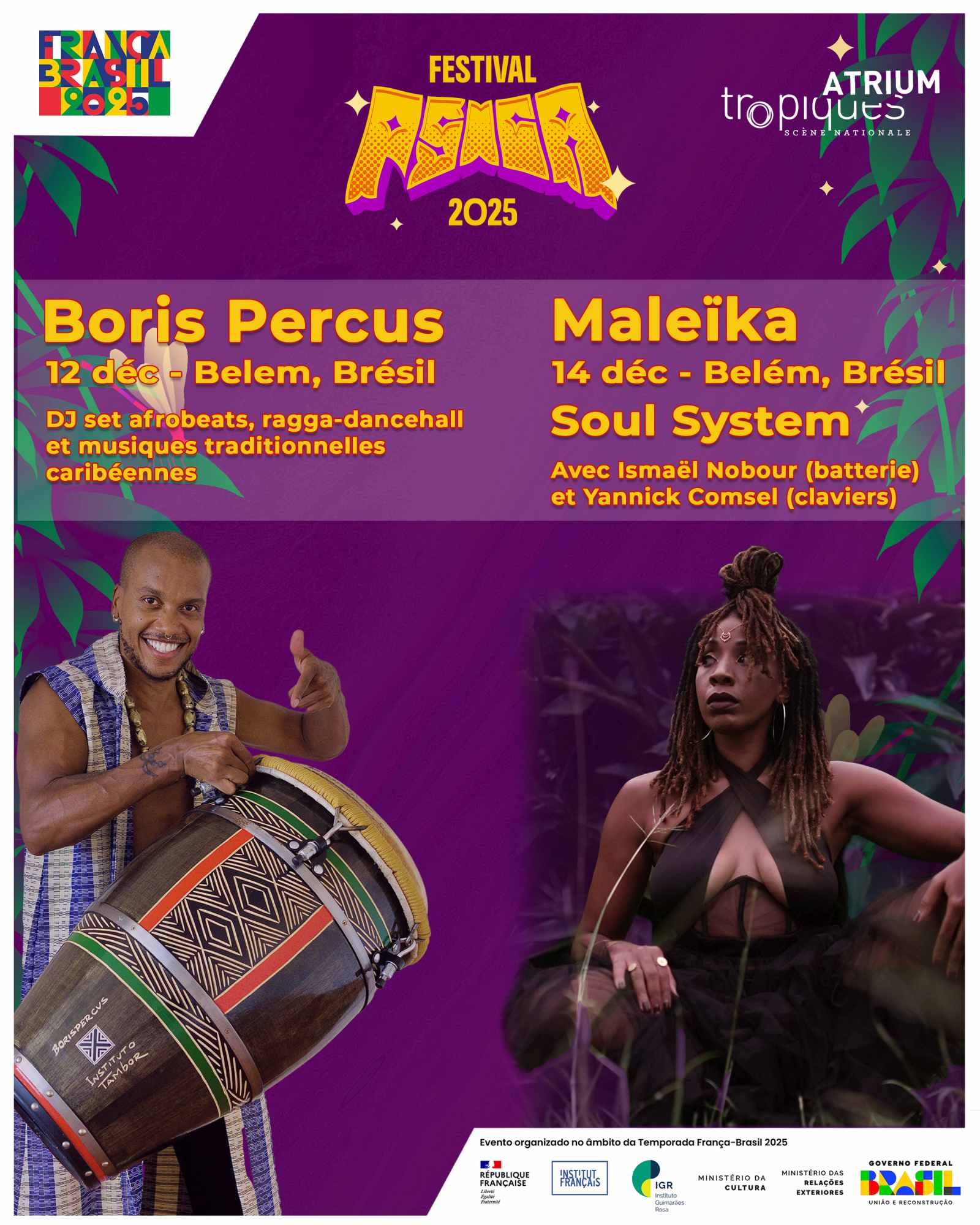 Dans le cadre de la saison France-Brésil, le festival brésilien Psica, de Belém, s’associe à Tropiques Atrium pour présenter en décembre 2025, deux artistes emblématiques de la scène Musiques actuelles martiniquaise : Maleïka et Boris Percus.