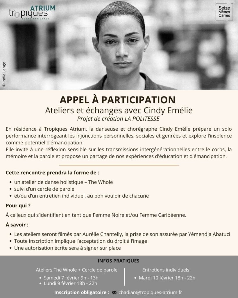 En résidence à Tropiques Atrium, la danseuse et chorégraphe Cindy Émélie prépare un solo performance interrogeant les injonctions personnelles, sociales et genrées et explore l’insolence comme potentiel d’émancipation.
